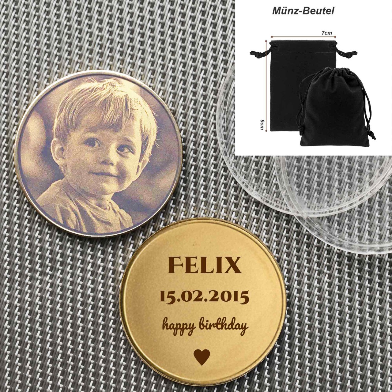 +49 6102 719 8430 Hochzeitsmünze personalisiert – mit Gravur von Namen & Datum aus Messing