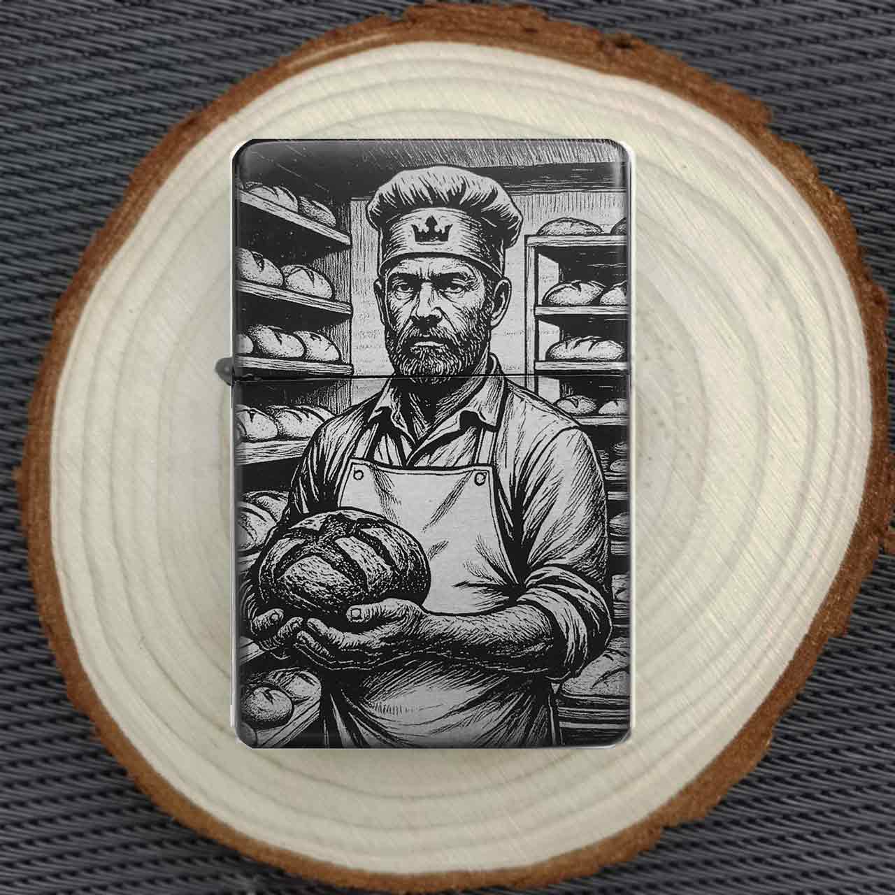 Mit Leidenschaft am Werk. Dieses Feuerzeug ehrt die harte Arbeit in der Backstube und zeigt einen Bäcker in Aktion. Ein tolles Geschenk für alle, die das traditionelle Handwerk lieben und leben. Die detailreiche Gravur erzeugt in ihren Grau- und Schwarztönen einen tollen Kontrast zur schwarzen Oberfläche und macht die Szene besonders lebendig.