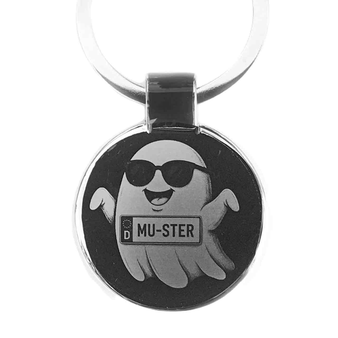 Für einen spuktastischen Auftritt! Dieser witzige Schlüsselanhänger wird mit deinem persönlichen Wunsch-Kennzeichen auf der Vorderseite graviert, cool präsentiert von einem Geist mit Sonnenbrille. Das perfekte, individuelle Geschenk für jeden Auto- oder Motorradfahrer mit Humor. Die detailreiche Gravur erzeugt in ihren Grau- und Schwarztönen einen tollen Kontrast zur spiegelnden Oberfläche und macht das Comic-Motiv besonders lebendig.