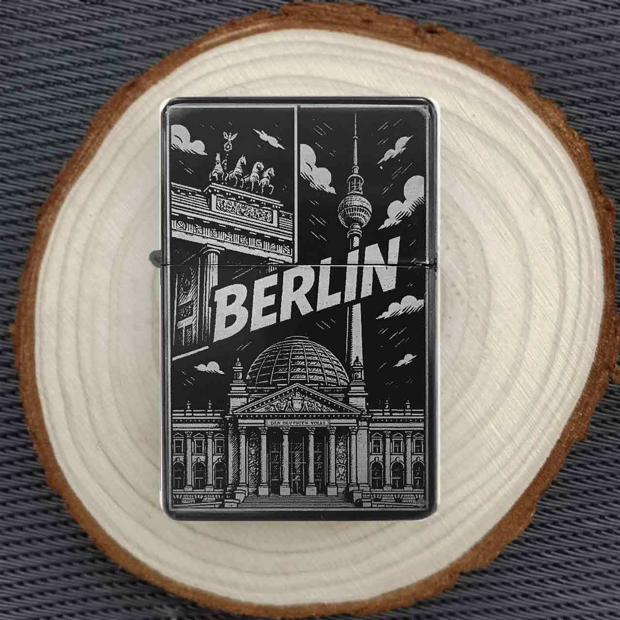 Trage ein Stück der pulsierenden Hauptstadt immer bei dir. Dieses Feuerzeug zeigt die unverwechselbare Skyline von Berlin mit ihren berühmtesten Sehenswürdigkeiten wie dem Brandenburger Tor, dem Fernsehturm und der Reichstag. Das perfekte Souvenir oder Geschenk für jeden Berlin-Liebhaber. Die detailreiche Gravur fängt die Silhouette der Stadt eindrucksvoll ein.