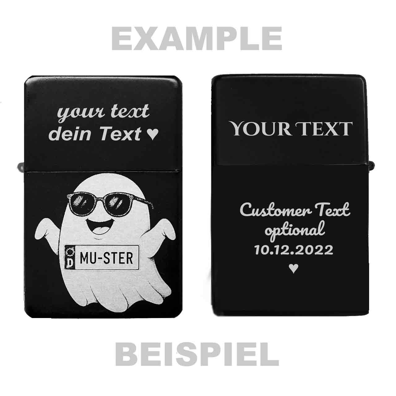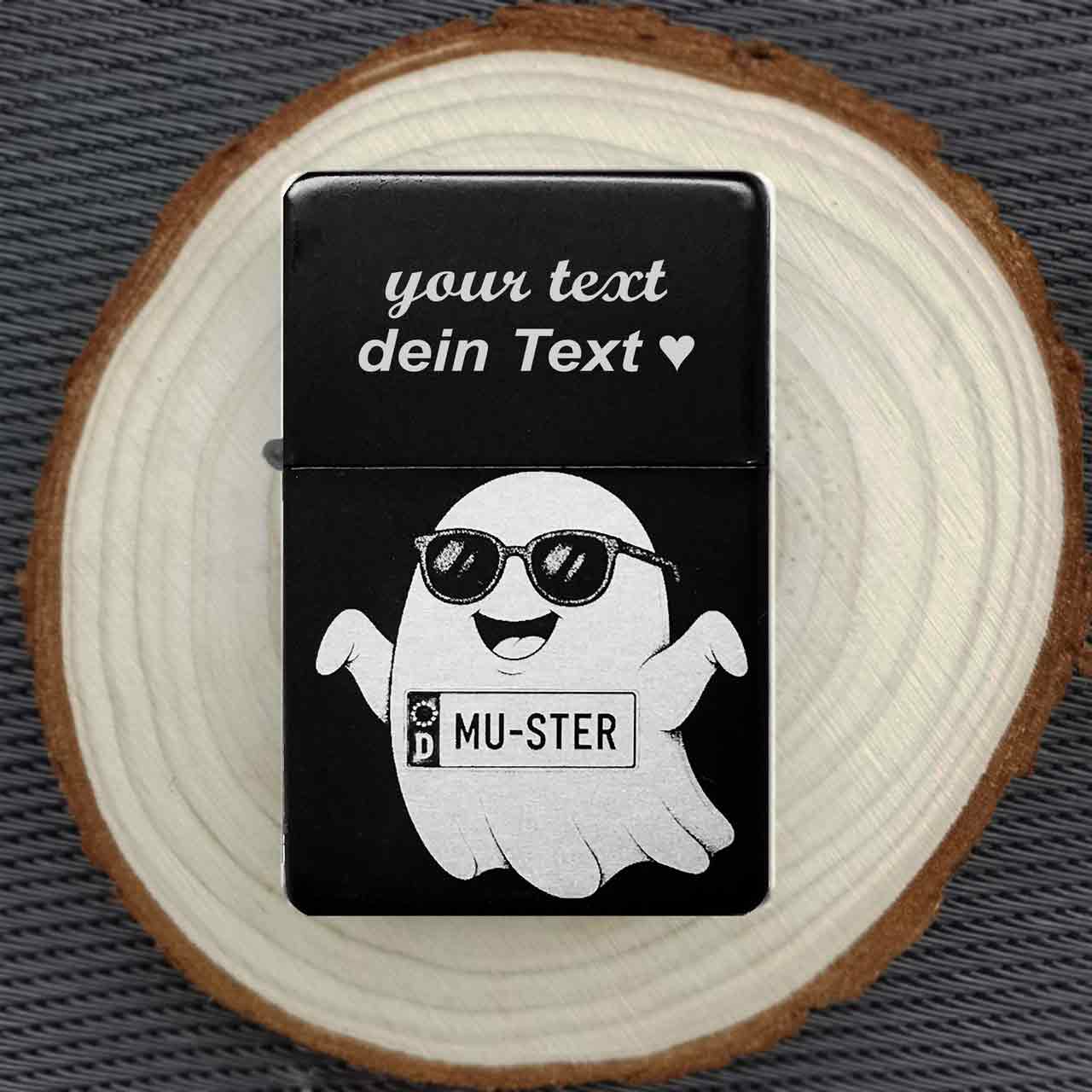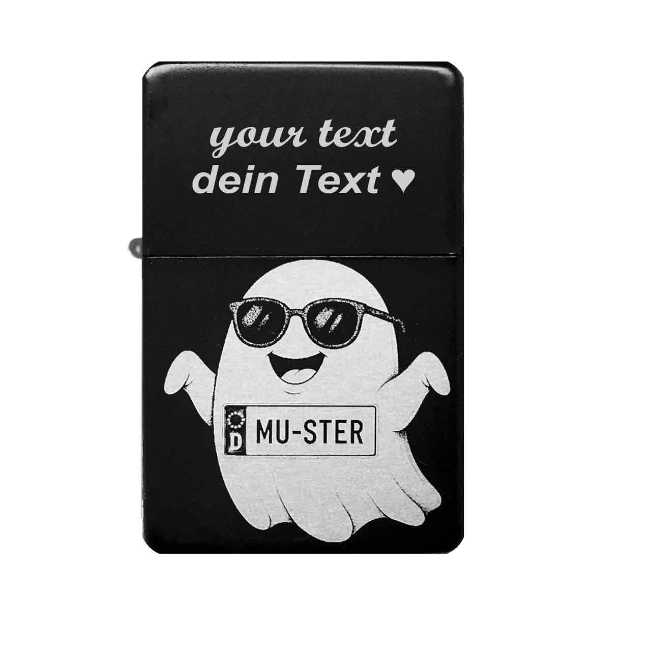 Für einen spuktastischen Auftritt! Dieses witzige Sturmfeuerzeug wird mit deinem persönlichen Wunsch-Kennzeichen auf der Vorderseite graviert, cool präsentiert von einem Geist mit Sonnenbrille. Das perfekte, individuelle Geschenk für jeden Auto- oder Motorradfahrer mit Humor. Die detailreiche Gravur erzeugt in ihren Grau- und Schwarztönen einen tollen Kontrast zur schwarzen Oberfläche und macht das Comic-Motiv besonders lebendig.