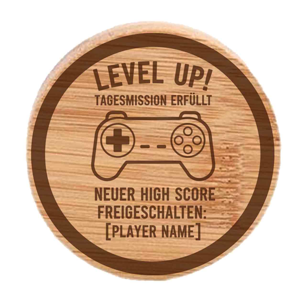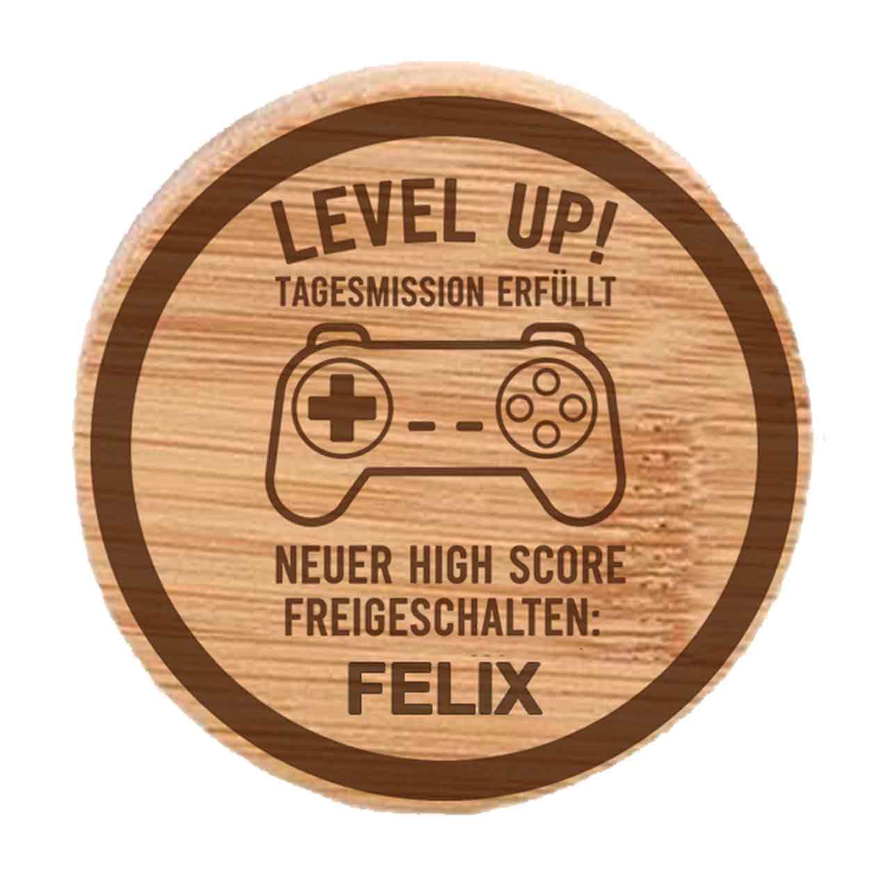 Ein Design für echte Spieler: Die Gravur "LEVEL UP! TAGESMISSION ERFÜLLT" spricht jedem Gamer aus der Seele. Der Controller in der Mitte macht sofort klar, worum es geht. Die Krönung ist der freigeschaltete High Score für den Feierabend.