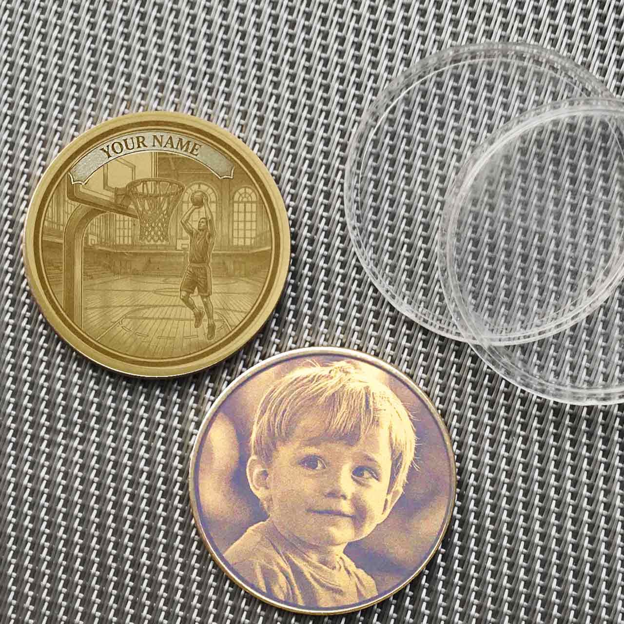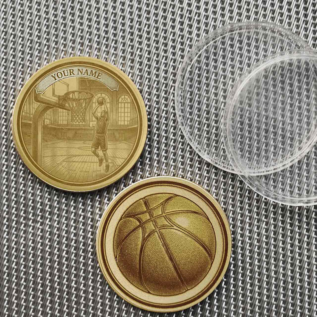 ✓ Beschreibung: Die Basketball-Münze zeigt auf der Vorderseite eine Szene mit einem Spieler beim Korbwurf und einem Namensbanner. Die Rückseite zeigt standardmäßig einen großen Basketball, kann aber optional mit einem eigenen Foto personalisiert werden.