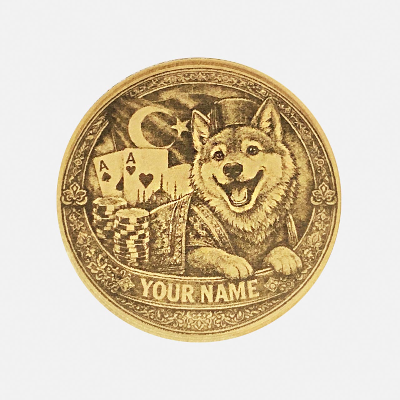 ✓ Beschreibung: Vorderseite mit humorvollem 'Poker Pascha' (Hund mit Fes) vor Istanbul-Kulisse, Halbmond & Stern. Dazu Namensbanner. Rückseite standardmäßig als Casino-Chip, optional mit Fotogravur.