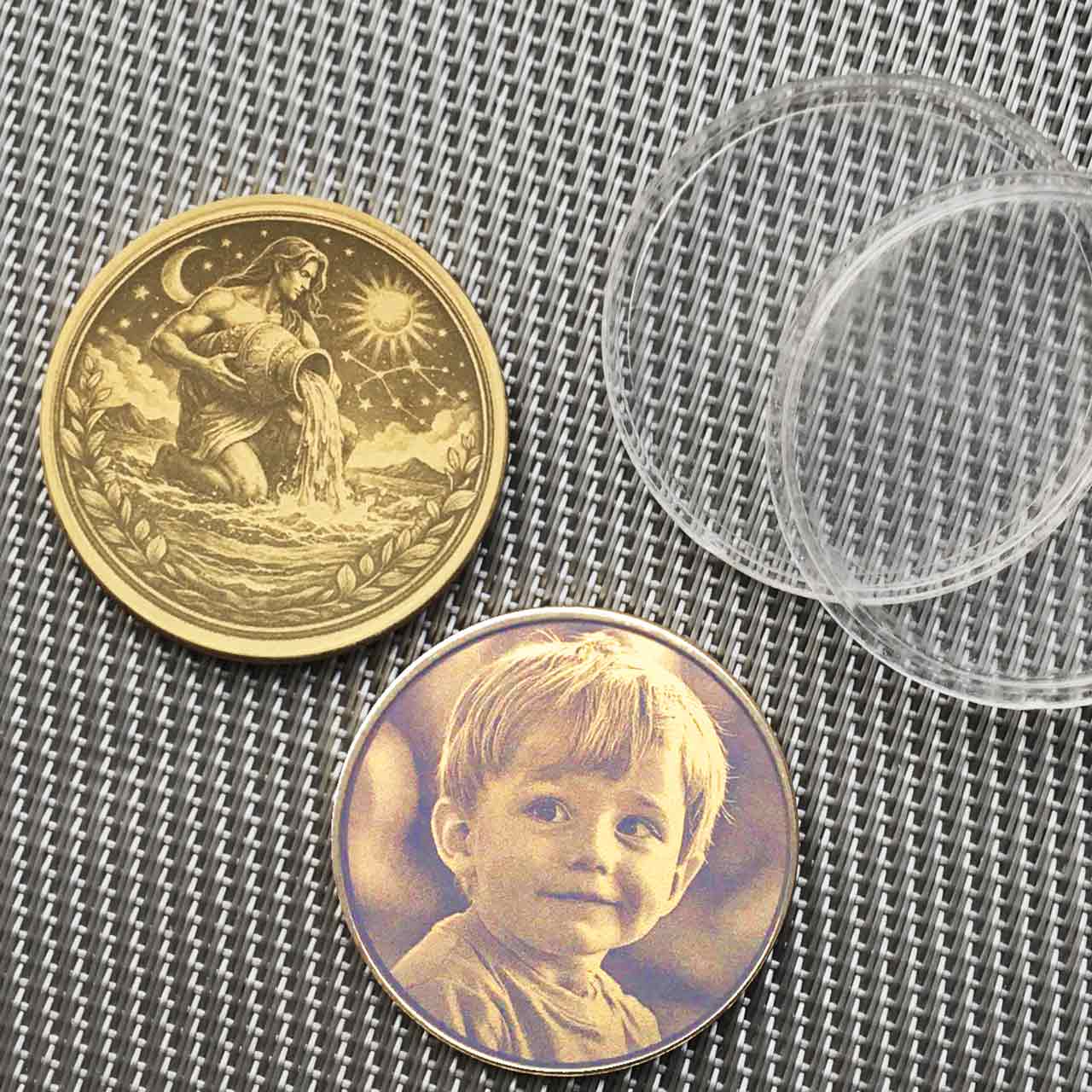 Optional: Foto-Upgrade: Mach die Münze zum absoluten Unikat! Gegen einen Aufpreis gravieren wir statt des Wolken-Designs ein eigenes Foto vollflächig auf die Rückseite – zum Beispiel das Bild des Beschenkten, der Kinder oder ein Partnerfoto oder ein eigenes Design.