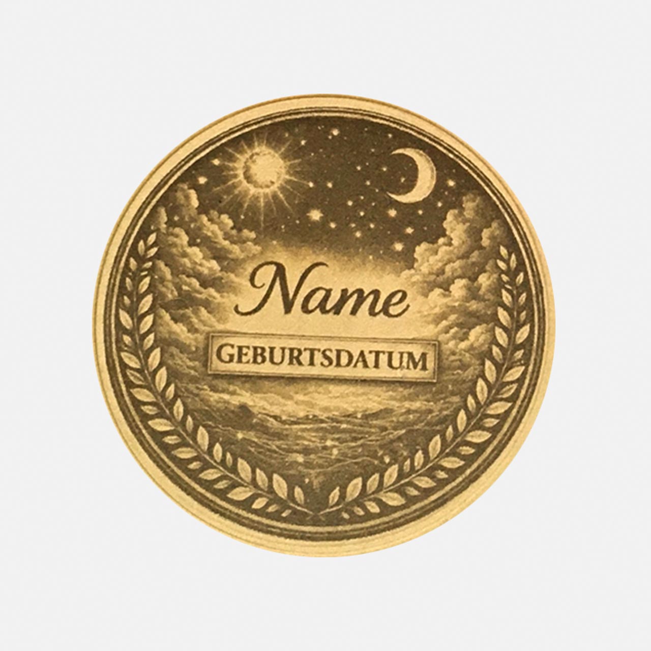 Die Rückseite – Himmlisches Design: Die Rückseite ist standardmäßig passend zum Thema gestaltet: Ein kunstvoller Hintergrund aus Wolken, Sonne und Mond. Hier gravieren wir harmonisch Namen und Geburtsdatum ein.