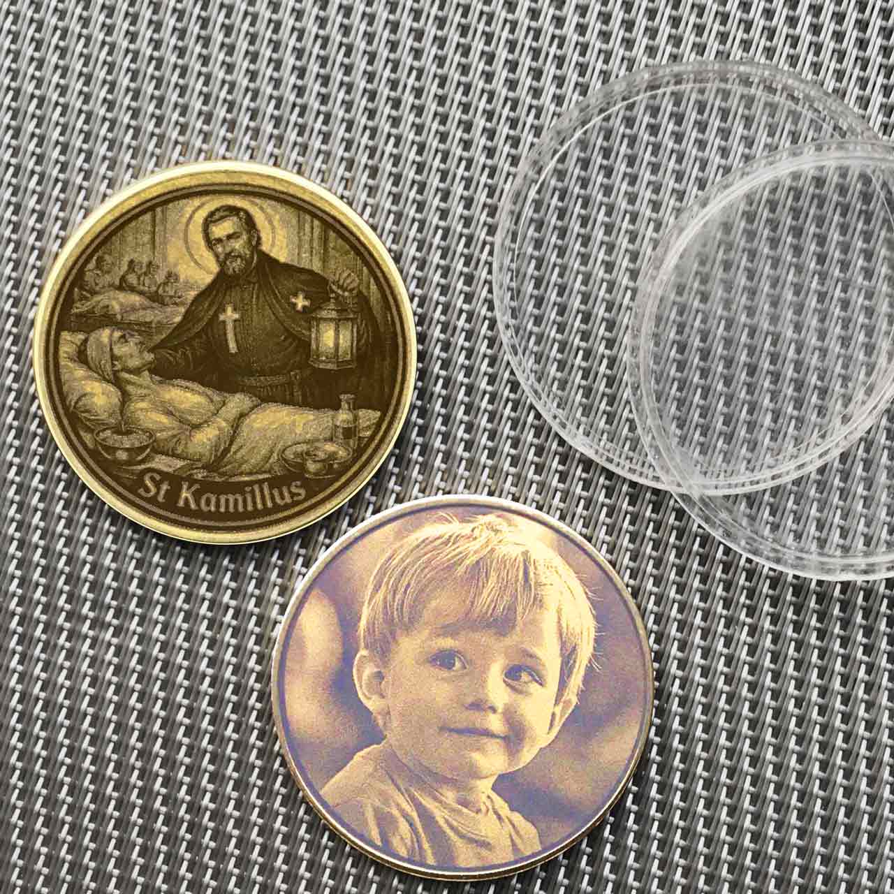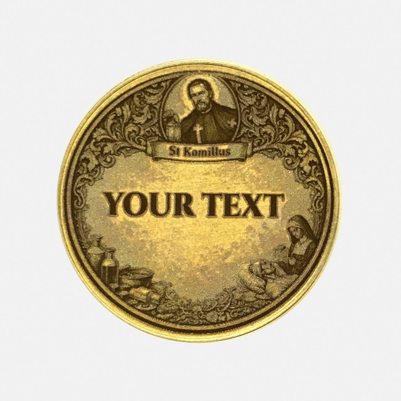 Pflege ist Nächstenliebe in Aktion. Diese massive Messingmünze ehrt den Heiligen Kamillus, den Schutzpatron der Kranken, der Krankenhäuser und des Pflegepersonals. Sie ist ein starkes Symbol für Trost und Beistand in schweren Stunden. Verschenke diese Schutzmünze als Dankeschön an eine engagierte Pflegekraft, zur bestandenen Prüfung in der Krankenpflege oder als Hoffnungsträger für jemanden am Krankenbett. Durch deine individuelle Gestaltung wird sie zum persönlichen Unikat. Du hast die Wahl: Veredele die Rückseite mit einem Wunschtext (eingebettet in einen thematisch passenden Rahmen mit Pflegeszene und Medizin-Utensilien) oder lade ein eigenes Foto hoch, das wir mittels präziser Lasergravur verewigen.