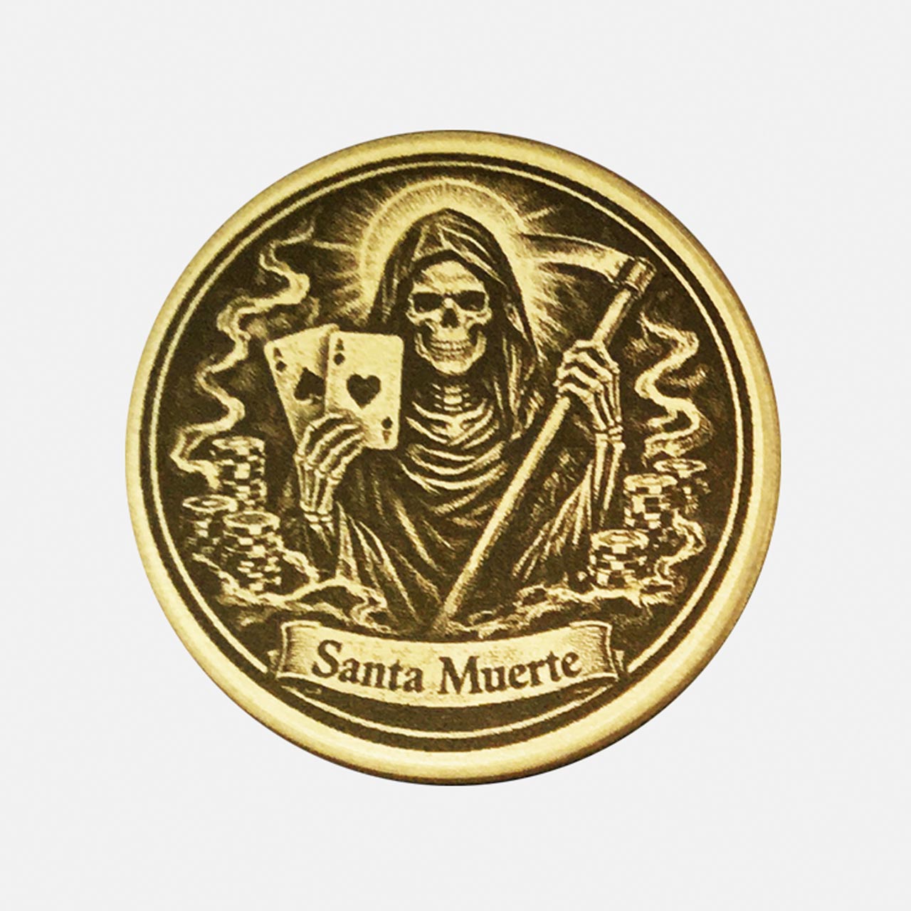 Diese Messing-Münze zeigt das Motiv „Santa Muerte“ als Gravurdesign.