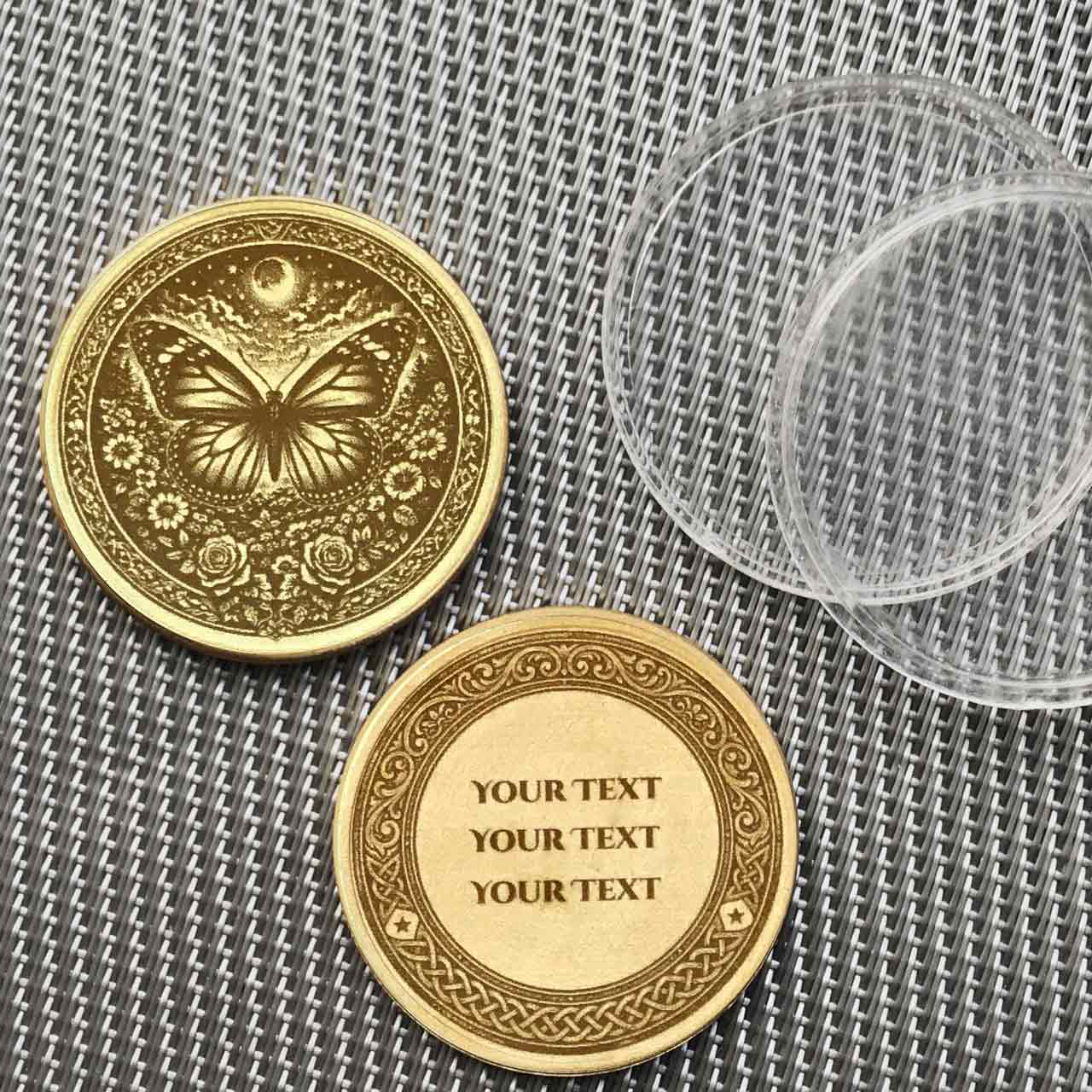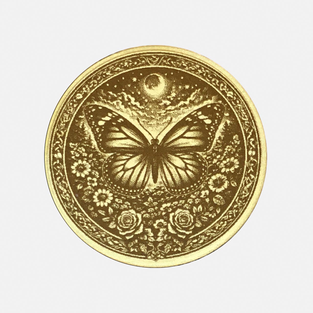 Die Vorderseite – Der Schmetterling: Das gelaserte Motiv zeigt den Schmetterling. Als Krafttier steht er für die Entfaltung des eigenen Potenzials und den Schutz bei Neuanfängen.