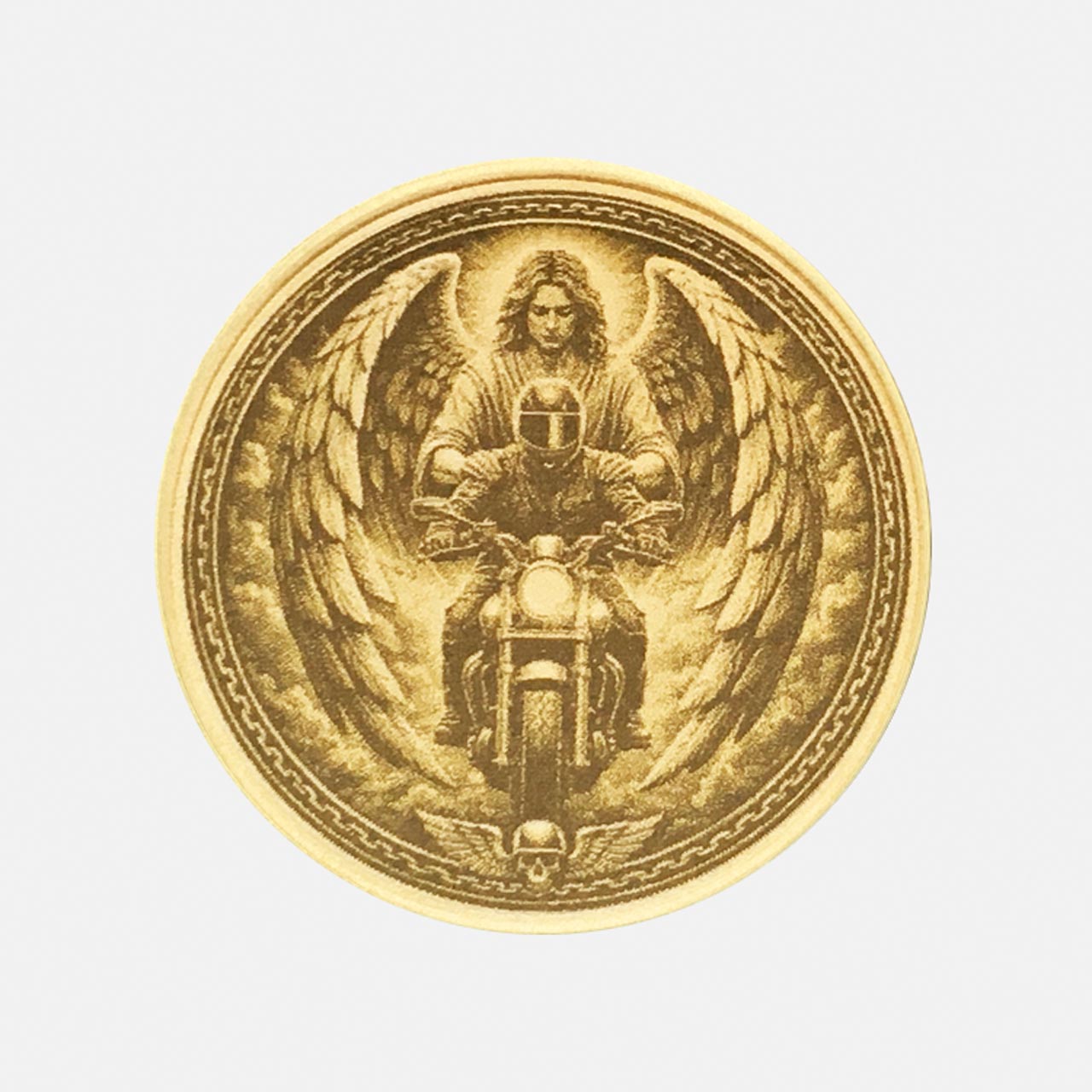 Een beschermengel die meerijdt. Deze massieve munt van echt messing is de ideale geluksbrenger voor elke motorrijder. Het symboliseert veiligheid, vrijheid en altijd een behouden thuiskomst van elke tocht.